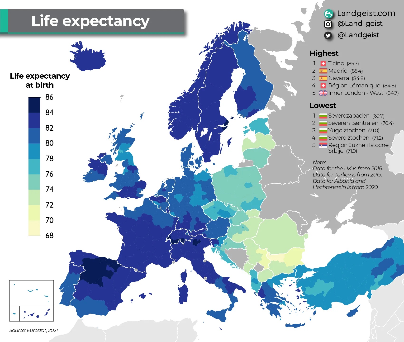 Original post: “I found another life expectancy chloropleth map, this time focusing on Europe. In the reading, Muth refers to a Datawrapper feature that confirms whether your visualization adheres to appropriate levels of accessibility to the colorblind, a useful tool for ensuring inclusivity. I think the color scheme in this chloropleth works well, although I’m not sure if the scheme is accessible to those with color-blindness. I find the placement of additional information (Highest/lowest regions) to be clever in utilizing space with no information recorded. I’m curious how areas are sectioned off as most countries in the visualization are split into smaller regions.”